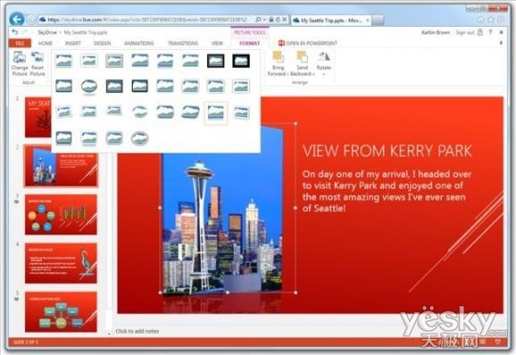 Word Web应用程序有一个新的页面布局和更大的格式化功能。 PowerPoint支持创建过渡和动画; Excel图表呈现一个全新的互动页面,也显著提高了Excel在网络上的数据表;OneNote则有更好的导航和搜索。