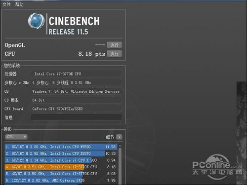 CPU性能测试:Cinebench R11.5 3D渲染测试 | ||||