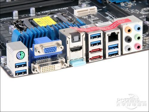 这款主板的I/O接口非常丰富,包括1个PS/2键鼠接口、6个USB3.0接口(2个原生,4个VIA芯片提供)、VGA+DVI+HDMI+DP超全视频输出、光纤音频输出、2个E-SATA接口、RJ-45网线接口和8声道音频,充分满足高端用户的需要。