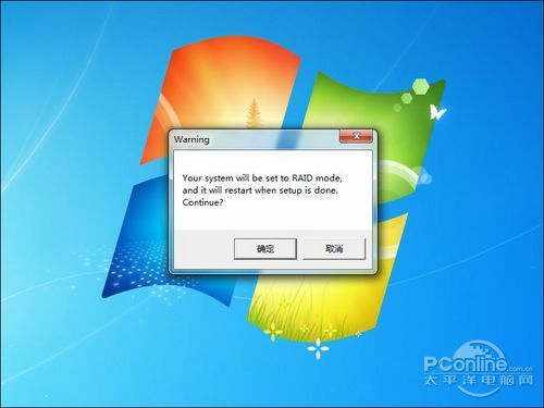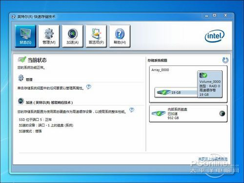 智能响应需要把硬盘设置成RAID模式才能用,因此按下Setup之后软件会提示系统即将被设置成RAID模式,这时取消的话会取消安装。选择确定,然 后机子就会开始自动重启,几番自动安装和重启之后,软件最后会提示已经安装完毕,弹出快速存储软件界面,停在桌面,这时智能响应就已经安装设置完毕了,可 以直接使用。