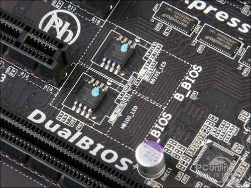 这款主板采用3D BIOS设计,不仅可以用键鼠轻易控制设置,还具备双BIOS功能,带BIOS切换开关,可以最大限度保证主板的可靠性。