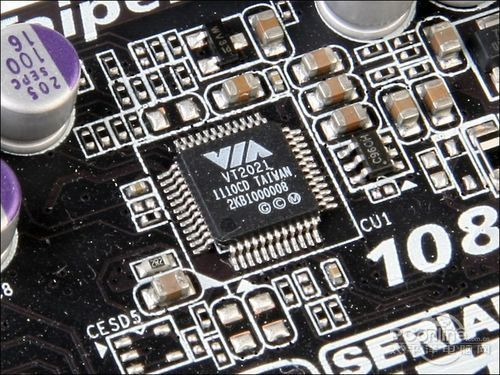 这款主板使用的是VIA出品的VT2021高清声卡,只为一些高端主板提供,它支持8声道音频输出,输出/输入分辨率为24bit/24bit,采样率 为192/192kbps,信噪比达110/100dB,水平和Realtek最强的ALC889差不多,只是驱动软件方面比较有差异。