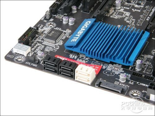 这款主板具备6个SATA磁盘接口,其中2个白色的是原生SATA3.0接口,其余4个是SATA2.0接口,支持RAID功能和智能响应功能,可以用 固态硬盘为机械硬盘加速,明显改进数据的读取速度。此外这里还设有OC-PEG接口,可以用SATA硬盘的供电接口为显卡提供额外供电,强化超频的稳定 性。