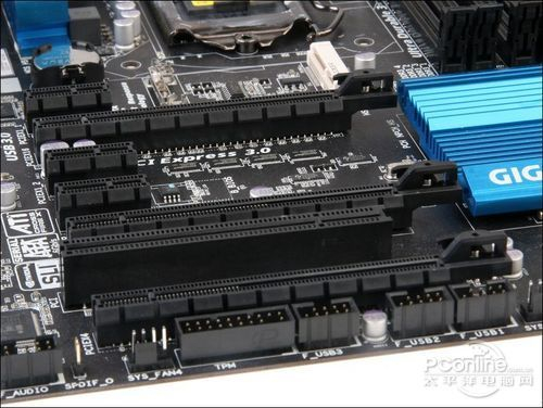 主板一共配备7条扩展插槽,其中3条是PCI-E 显卡插槽,3条是PCI-E x1扩展插槽,1条是PCI插槽。第一和第二条显卡插槽由CPU提供,支持最新的PCI-E 3.0标准,可以组建x8+x8模式高性能双卡交火/SLI,最后一条显卡插槽由主板芯片提供,速度为PCI-E 2.0 x4,并且与PCI-E x1扩展插槽共享带宽,因此用上之后就不能使用PCI-E x1扩展了。