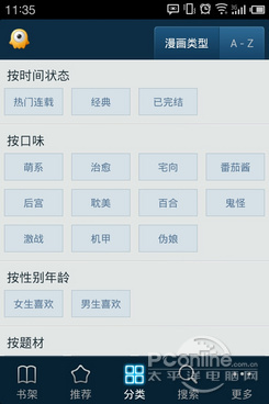 分类也是布卡漫画做得比较好的一个功能,小编觉得最有价值的就是按口味按题材分类了,无论你是怪叔叔还是腐女,都能找到自己喜欢的类型。当然,布卡漫画也没把传统的按首字母查找漫画的功能拉下。