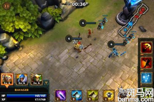 一款即时战略游戏,混合了DOTA和LOL要素,战斗方式自然是指挥这英雄去推塔。在游戏中玩家一共可以控制三个不同的英雄,通过左下角的英雄头像图标,可以实现快速的切换控制。而右侧则是每个英雄的技 能快捷按键,一共有四个。