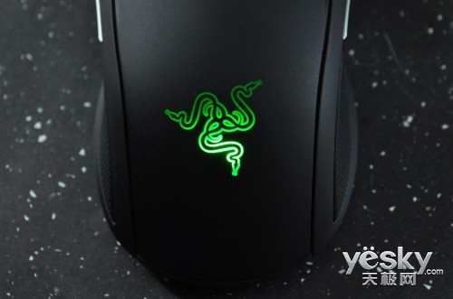 鼠标的背部有三头蛇LOGO,绿色呼吸灯。不过射灯有一定的方向性,在其他角度看LOGO并不会像上图中的那样明亮。