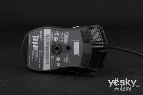鼠标底部有两颗光头,一颗为光电式,用于表面检测,一颗为激光(安华高A9800定制版S9818),负责移动传感。太攀皇蛇贴脚一共有3块,脚贴面积不大,但一贯的特氟龙材质保证了其顺滑度。在上图我们能看到太攀皇蛇的头部有类似跑车进气栅格的设计,虽然自己在用鼠标时看不见,不过总体在设计上太攀皇蛇显得独具一格,个性张扬。
