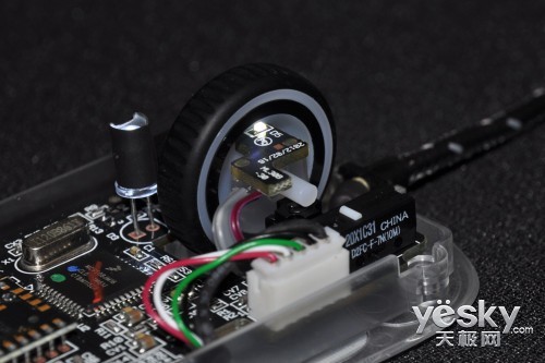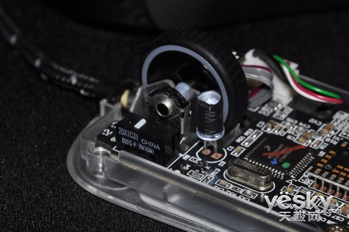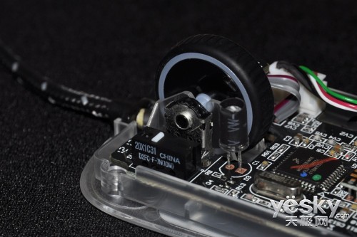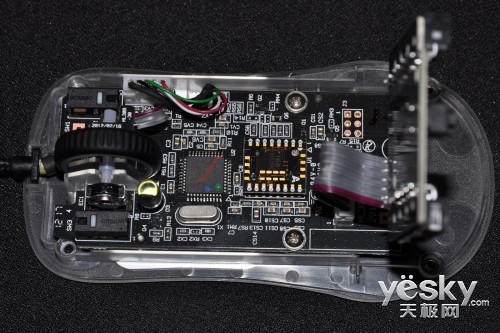 拆解环节:左右按键均为欧姆100万次寿命的D2FC-F-7N(10M),右键下方由于有排线插,导致右键与左键呈反向布置,滚轮灯是由带贴片白色LED灯的一小片PCB实现的,尾部灯带了个橡胶套帽以实现让光打散呈现出柔化效果,而DPI按键的灯是由左键右下方一颗带黑色围裙的LED灯实现,从上盖DPI按键是由一整条白色半透明光带进行折射实现白色灯效果来看,DPI灯可导致鼠标前方漏光是赛睿故意所为,不过确实鼠标左前方通过透明底盘漏一点白色光视觉效果不错,不过编辑希望的倒是和以前的微软一样,从尾部透出光那就更赞了。整体而言,Sensei RAW内部做工严谨,电路板上有大量贴片元件,符合大厂的风范。