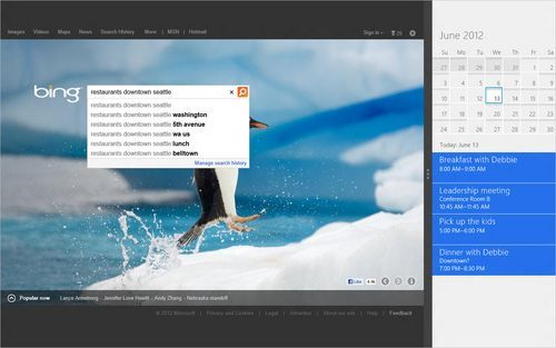 Bing是微软自家的搜索服务,高度集成在Windows 8 RTM版的Metro模式中。