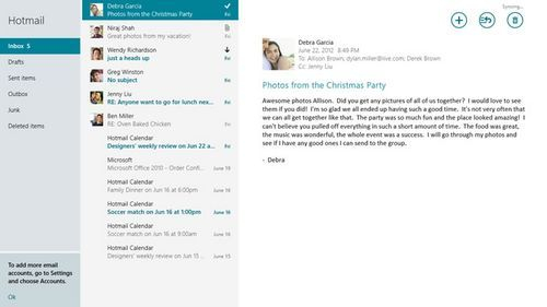 Win8 RTM内置的邮箱App,加入了大量的可视化元素,比如联系人头像等等。