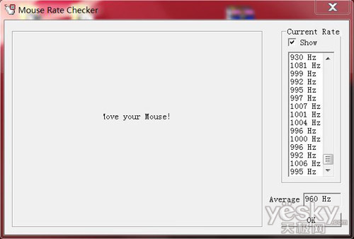 将血手幽灵智能多核左三枪V7游戏鼠标调整至1000hz的回报率,在Mouse rate checker鼠标回报率测试中,鼠标确实达到了1000hz,另外鼠标在高速移动中,回报率拨动幅度不大,能够稳定在1000hz附近。