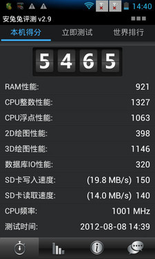 安兔兔评测是一个给Android手机、平板进行性能评测、跑分的软件,它能一键运行完整测试项目,通过“内存性能”、“CPU整数性能”,“CPU浮点性能”、“2D、3D绘图性能”、“数据库IO”、“SD卡读写速度” 8项性能测试,对手机的硬件性能做一个整体评分,让你对所有手机、平板性能有所了解。并可上传分数并查看世界排名,通过世界排名查看分数高的机型,也可查看当前手机的排名位置,分数越高代表手机性能越好。