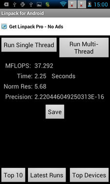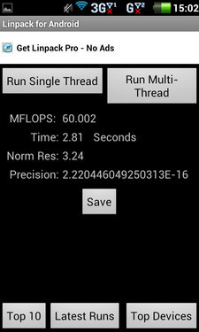 MSM8225处理器手机的Linpack测试结果(左为单线程右为多线程)