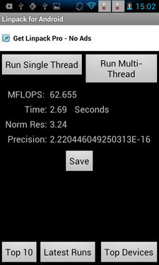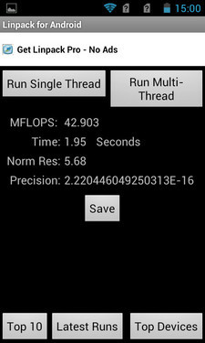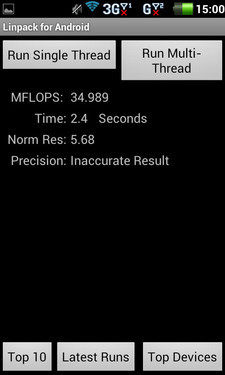 MT6577处理器手机的Linpack测试结果(左为单线程右为多线程)