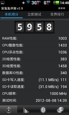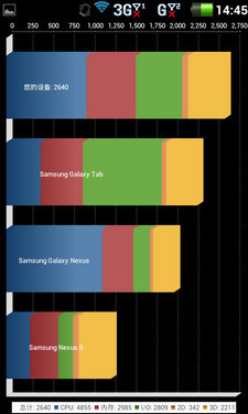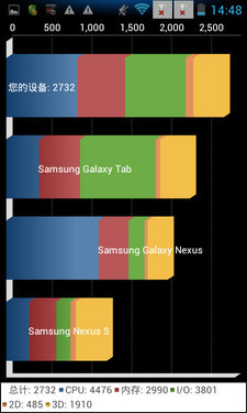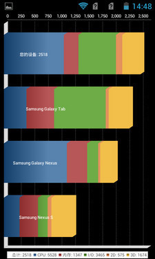 在象限的测试结果中,我们则又看到了不同的结果,从总数来看这款MSM8225的机型依然落后,但如果单看CPU性能的话则要略高过另两款产品。这或许是两款软件测试和评分机制不同的原因。