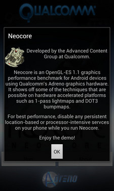 接下来看看专门的图形能力测试。我们选择的Neocore是一个基于OpenGL-ES 1.1 的图形性能基准测试软件。软件打开后会播放一段动画,在动画的最后软件会对运行软件的机器进行评定,并得出一个FPS值。FPS值就是指每秒刷新帧数,它决定你的画面是否流畅。FPS分数越高,代表手机图形能力越强。跑分成绩跟分辨率关系比较大。