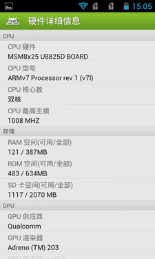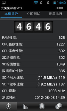 在目前最流行的的安兔兔的测试中,我们看到MSM8225手机的最终成绩较其它两款处理器手机低了不少。即使去除这款测试机在RAM、IO方面可能存在的差距,单看CPU的性能得分也依然比另外两款略低。