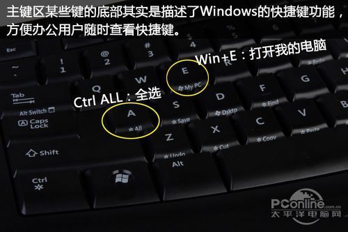 键盘取消了一些少用的实体按键,如右则的Win键,Application键等,而增加了一些方便我们日常办公和娱乐的按键,如计算器键,播放/暂停,音量加减按键。