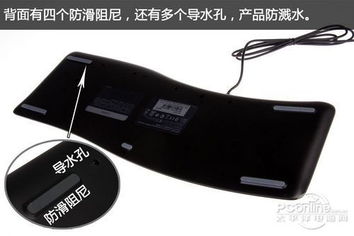如今的键盘,十有八九都有防溅水功能,微软 舒适曲线桌面套装3000的键盘也不例外,键盘底部一共有6个导水孔,日常不小心倒水进去键盘的话,赶紧把键盘拿起来,甩一阵子就差不多了。另外,键盘并没有支架,所以不支持调整高度,是为了不破坏其人体工学设计。