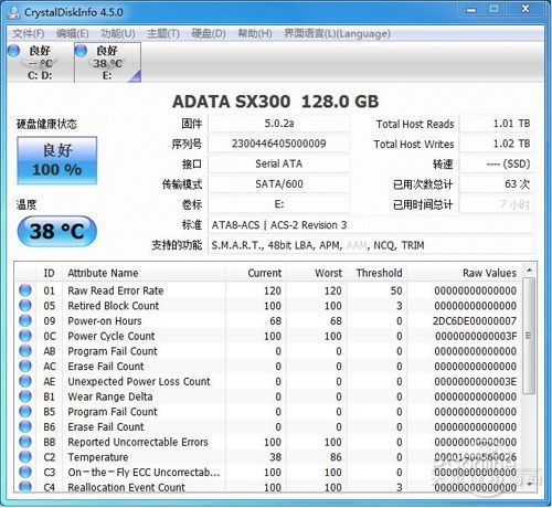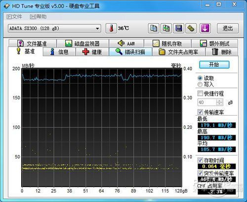 HD Tune是一款较常用的硬盘工具软件,能检测出硬盘的固件版本、序列号、容量、缓存大小以及当前的Ultra DMA模式等基本信息,另外硬盘传输速率测试、健康状态检测、温度检测及磁盘表面扫描等功能。其中硬盘传输速率测试常被用户用于检测硬盘的性能。HD Tune原本是用于机械硬盘测试,这里用来测试SSD并不具代表性,数据仅供参考之用。