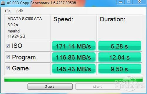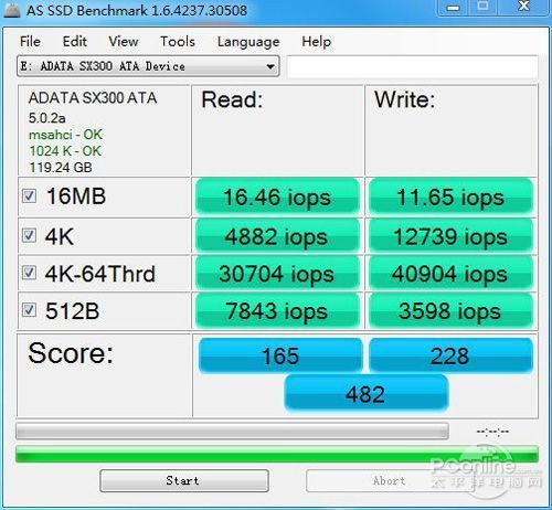 威刚 SX 300 mSATA固态硬盘测试部分主要分为理论性能与实际性能测试。所使用的测试软件分别为CrystalDiskMark、ATTO Disk Benchmark 、HD Tune Pro、CrystalDiskInfo,Fastcopy以及AS SSD Benchmark。测试前在BIOS中开启AHCI和主板节能模式,模拟用户的真实使用情况。