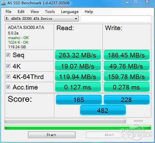 AS SSD Benchmark是一款专门的固态硬盘基准性能测试,它的测试内容很全面,包括了4个方面的测试(顺序读写、4K随机读写、64线程4K读写、寻道时 间)。在测试中,测试文件的大小为1G Byte。通过AS SSD Benchmark的测试,可以很全面的了解一款SSD的性能。