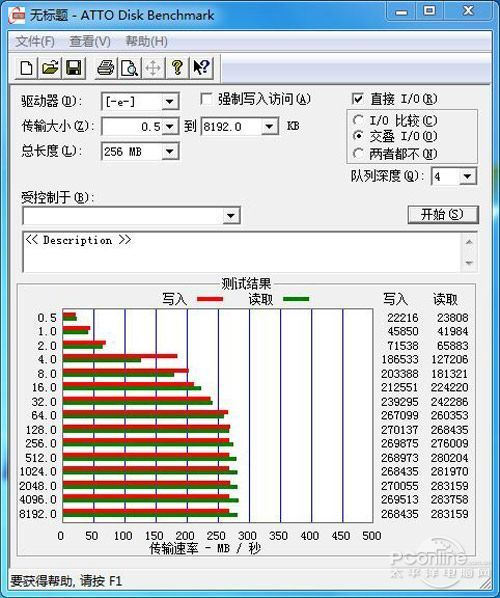 ATTO Disk Benchmark是一款简单易用的磁盘传输速率检测软件,可以用来检测硬盘、U盘、存储卡及其它可移动磁盘的读取及写入速率。该软件使用了不同大小的数 据测试包,数据包按0.5K、1.0K、 2.0K直到到8192.0KB进行分别读写测试,测试完成后数据用柱状图的形式表达出来,很好的说明了文件大小比例不同对磁盘速度的影响。