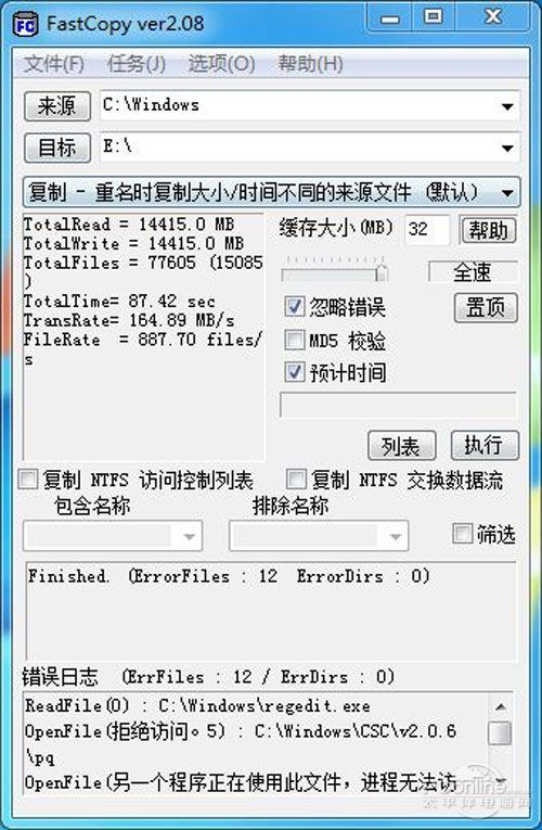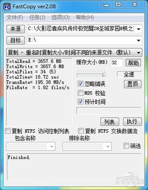 Fastcopy,是一个以优秀的文件复制工具,其复制速度比Windows自带的复制功能要快得多,因此该软件也被喻为最快的文件复制工具。我们用它 进行文件复制测试,毕竟复制操作是用户平时用得最多的写入操作之一,测试结果能较真实反应出磁盘在复制操作中的性能差距。