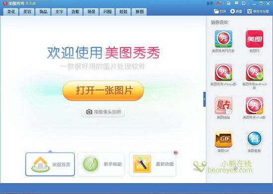 美图秀秀是一款非常简单好操作的软件,不用学习使用超级简单,美化、美容、饰品、文字、边框、场景、闪图、娃娃和拼图九大共功能模块前轻松帮助您实现修图和美化的过程,制作完的照片可以一键上传到人人网、微博等各大类网站,轻松秀自己。