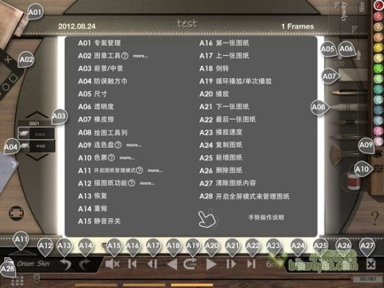 打开Animation Desk,即可直接进入到其画板页面,而围绕其一周的诸多工具,则会令人有些目不暇接的感觉。这时只要点击一下右侧下方的?既可以获得各种工具的对照说明,并且还有手势操作说明。