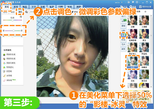 3、在“美化”菜单下选择50%的“影楼-冰灵”特效,然后点击“调色”按钮,微调彩色参数偏绿。