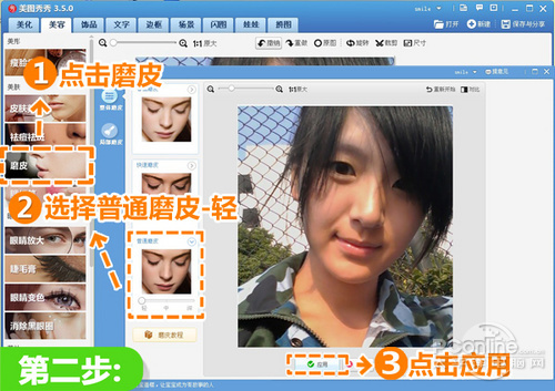 2、点击“磨皮”按钮,选择“普通磨皮-轻”特效,降低照片的噪点。
