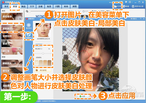 1、在“美图秀秀”软件下打开待处理的照片,在“美容”菜单下,点击“皮肤美白-局部美白”按钮,调整画笔大小并选择皮肤颜色对人物进行皮肤美白处理,然后点击“应用”按钮,轻松美白皮肤。