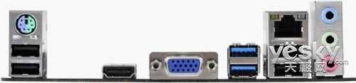 背板输出方面,主板提供了VGA/DVI视频输出、4个USB2.0接口,2个USB3.0输出接口,PS2键盘接口、打印机接口,千兆以太网卡和6声道音频输出。