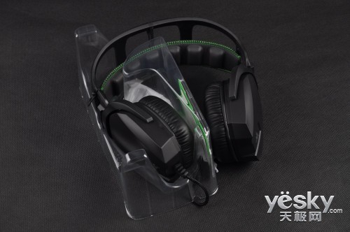 耳机的主体其实不用多做介绍,外观与兄长Tiamat 7.1非常类似,只是左右侧的耳机罩无法拆卸,默认只有一套磨砂外壳,同时由于并非USB供电的产品,耳机罩一侧的雷蛇LOGO也并不是灯光效果。