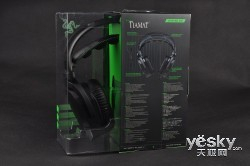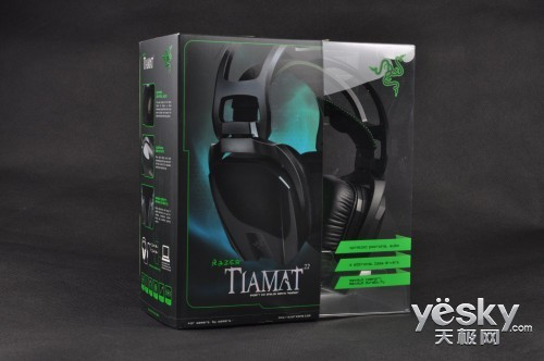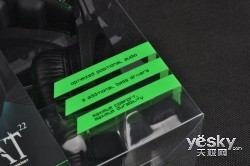 从包装上就不难看出,Razer Tiamat 2.2(迪亚海魔2.2)相比之前的7.1声道版本就将会是一款比较亲民的产品,它采用了一半透明、另一半包裹的透视包装,盒子的右侧露出半截耳机,购买之前能看到耳机的本尊,想必对用户选购也起到了正面的作用。