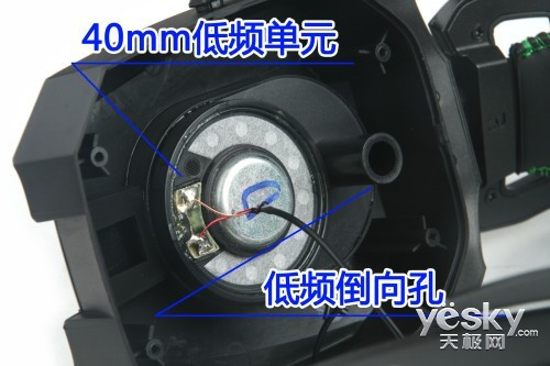 从上图我们不难发现,每一边的耳机都内置了2个单元,编辑猜测其中一个为低频单元,通过导向孔原理将低频通过图中的圆孔传导到耳罩内,另一个则是我们在普通耳机中常见的中高频单元。
