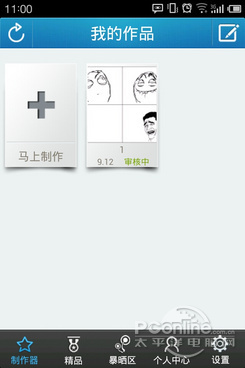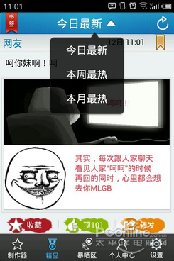 除了制作暴走漫画外,Android暴走漫画制作器也可以浏览其他网友制作的暴走漫画。回到主界面后,点击精品或者暴晒区一栏,即可查看网友制作的暴走漫画。精品和暴晒区的区别是暴晒区的暴走漫画没有经过筛选,精品区的质量则比较高。
