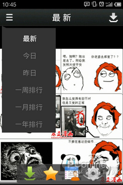 点击Android暴走漫画界面左上方的按钮,我们可以根据更新时间和热门程度等挑选暴走漫画。每一幅暴走漫画的下方都有一列功能按钮,我们可以评论、收藏、分享或者顶踩某幅暴走漫画,互动性不错。