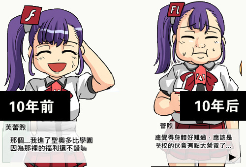 然而,Flash的成长似乎茁壮得有点过了头。Flash的功能越来越强大,开发人员使用Flash开发的产品也愈发繁多庞杂,Flash开始被用来干 一些奇怪的事情,比如说卖卖小广告啦,玩玩小游戏啦——这些应用多是粗制滥造,很难想象有人会为Flash广告优化代码,是吧。人们慢慢发现,当低劣的 Flash充斥着网页的时候,电脑开始不堪重负了,Flash落下了一个烤肉机驱动程序的称号。