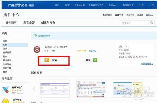 傲游浏览器3的用户可以直接在傲游3里访问12306订票助手的网页,然后直接点击安装。