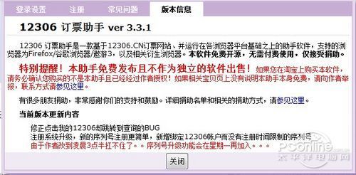 12306.CN订票助手是由【木鱼】开发的‘免费软件’,并没有授权任何人以任何形式在任何渠道上进行销售(如淘宝等),助手本身的使用也不收任何费 用!目前助手只接受捐助,如果您是从淘宝或任何第三方渠道购买的,请申请退款并向作者举报!同时强烈鄙视任何未经授权便拿来为自己谋利的无良卖家!