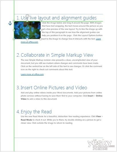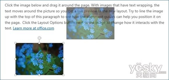 在新Word2013中,当我们拖动浮动图像时可以看到文档布局的实时变化,这样可以一次就快速高效完成图像位置的精准调整。当我们对内嵌和浮动图像做尺寸放大、旋转以及调整表格的行列等操作时也能看到实时的布局变化。
