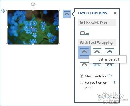 想要修改和设置默认的环绕风格也非常简单,只需右键点击“布局选项”样式,选择“设为默认值”即可。下一次当我们插入图片、图表或SmartArt图形等对象时,Word2013就会使用上次设置的默认环绕选项。