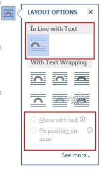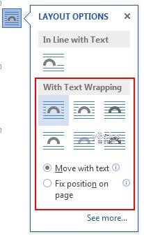 2、布局选项菜单中底部的“随文字移动”与“固定位置”选项(“Move with text” vs. “Fix position on page”)选项变为可用。