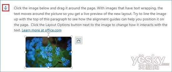 图文混排中有一中图像形式是“浮动”。正如前面提到的,内嵌图像就像是一个可见的超大字符。然而,浮动图像可以作为隐藏的字符附加到文本,这个 隐藏字符就是我们所说的“锚”。在过去的版本的Word中需要进入Word的高级选项对话框中才能打开锚显示。为了使用更加明显,新的Word2013中 默认打开了这个选项。