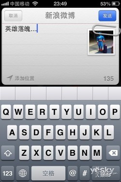升级至苹果iOS 6正式版本后,新浪微博分享功能界面与其beta测试版本基本保持一致,绑定新浪微博账号、选择所要上传的照片、编写相应文字内容后,我们即可完成相应分享。新浪微博网页版中可以看到其已能够正常分享照片,来源则与此前相同为“来自iOS”。