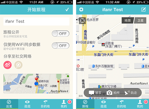 在“出发”中用户即可开始记录一段旅行。用户可以选择是否将旅行公开。轨迹模式用来选择应用是否在后台持续追踪位置信息,分为步行模式和乘车模式。GPS 会记录下整个旅行的里程。此外,BreadTrip 支持离线模式,避免网络问题以及流量的困扰。