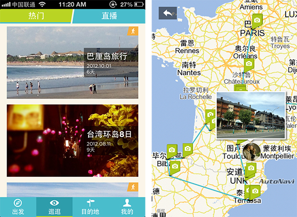 应用的 UI 非常清新,底部分为“出发”、“逛逛”、“目的地”和“我的”四个类别。首页默认显示“逛逛”中系统推荐的优秀旅行游记,分为“热门”和“直播”两种方式,用户可以查看他人的分享。